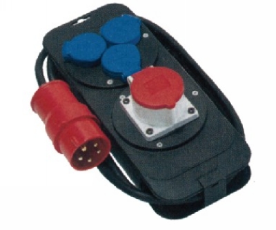 用于配电,电气安装和维修。适合户外使用,电缆2m长。CEE400V三相五相防水插座1个,230V/16A两相插座3个。耐撞塑料壳,可绕线。便携式,亦可挂墙使用。