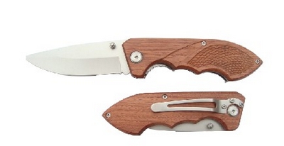 刀刃上带有锯齿刃,木质花纹。有锁定按钮。折叠后长120mm。