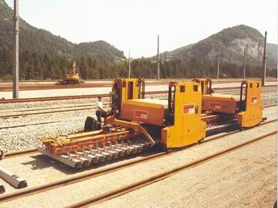 用于轨排的提起,运输和铺设 PA 250有两个起重机,通过吊梁连接 用于铺设13-20m的轨排 每个起重机提升能力为 11 t 两个轨排可同时提升